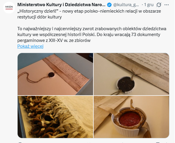 Do Polski wraca część utraconego dziedzictwa: 73 średniowieczne pergaminy polsko-krzyżackie z XIII–XV wieku ze zbiorów AGAD oraz gotycka rzeźbiona głowa św. Jakuba Starszego – fragment wystroju kościoła NMP na Zamku Wysokim w Malborku. Zwrot ogłoszono w ramach polsko-niemieckich ustaleń dotyczących restytucji dóbr kultury.